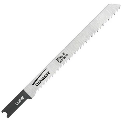 Longueur totale 100 mm. Longueur utile 75 mm. Epaisseur 1,27 mm. Largeur 7,8 mm. Pas : 2,5 mm , 10 Tpi. Emmanchement Black et Decker. Dos de lame avec dépouille conique, dents rectifiées. Coupe propre. Convient pour la coupe de tous types de bois, et les plastiques (3-30mm). Made in Germany. Livré par 5 pcs. Réf type L100W5.