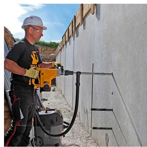 Perçage dans les bétons armés, les bétons, la pierre, la maçonnerie, la brique pleine, le calcaire, reprise de fers à béton : dans les parties structurelles, rénovation ou amélioration de charpente, travaux de perçage à réaliser dans des espaces intérieurs, salles blanches, h™pitaux, laboratoiresÉ Deux larges trous d’évacuation des poussières. Manchon de raccordement au système d’aspiration. Tête massive système, 100% carbure, 10 taillants. Pointe de centrage. Réduction du corps du foret avec bague de centrage selon modèle. Avantages : Travail sans poussière. Réduction des risques sur la santé liés à la poussière. Perçage et nettoyage des trous et du chantier en une seule étape. Gain de temps sur le perçage et sur la mise en oeuvre des ancrages pour une plus grande rentabilité des chantiers. Nettoyage parfait du trou pour un ancrage plus résistant. L’évacuation de la poussière pendant le perçage augmente également la durée de vie du foret. Dimensions : D. 14 x Lu. 400 x Lt. 610 mm. Emmanchement : SDS-Max.