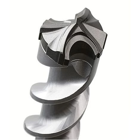 Applications : Perçage dans les bétons armés, les bétons (frais ou rénovation), la pierre, la maçonnerie, la brique pleine, le calcaire, reprise de fers à béton dans les ponts et les tunnels, installation de dynamite, passage de tuyaux ou de gaines électriques, pose de poteaux de clôture, particulièrement adapté aux travaux des plombiers et des électriciens. Features : TÊTE MASSIVE SYSTéME 100% carbure – 10 taillants. 6 taillants frontaux : 2 principaux, 2 secondaires et 2 centraux. 4 taillants latéraux. 6 stabilisateurs latéraux. Angle de 130° elliptique. Combinaison optimale des arêtes concaves et convexes. Pointe de centrage. Tête monobloc sertie. Brasure au cuivre spéciale haute résistance. Hélice à âme progressive. 2 canaux de dégagement très importants et double hélice de grand volume. Attachement compatible SDS-max. Benefits : Idéal pour les armatures, durée de vie extrême. Perçage des fers à béton les plus gros. Vitesse de perçage inégalable. Grande capacité d’évacuation des poussières et gravats. Capacité de coupe des aciers décuplée grâce aux 6 taillants frontaux : effet démolition. Grande résistance à la chauffe, à la rupture et à tous les cas d’utilisation. Idéal sur perforateur puissant. Confort d’utilisation, moins de vibration. L’acier allié de très haute qualité, le carbure de tungstène Prémium et le traitement thermique sous atmosphère contrôlée optimisent à 100% la restitution de la frappe du marteau perforateur.