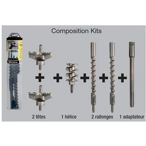 Ce kit de perçage béton SDS-MAX est composé de : 1 adaptateur Lt 250 + 2 rallonges Lt 280 + vis + 1 hélice + 1 vis d’accouplement + 2 têtes D. 32 et 44 mm.